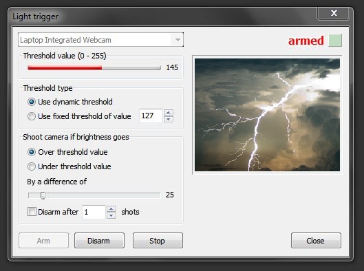 Under 'Threshold type' you can indicate if you want to use the dynamic threshold value or set your own 'fixed' threshold value. If you use the dynamic one, the camera will fire only once when the webcam detects a sudden increase or decrease of brightness. After that, the dynamic threshold will have adapted to the new brightness level (the level that triggered the shot), and the camera will then only shoot if the brightness level goes up again (or down - depending on the under or over settings). This setting is mainly handy when you're only interested in the change from dark to light or v.v.